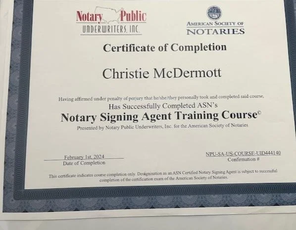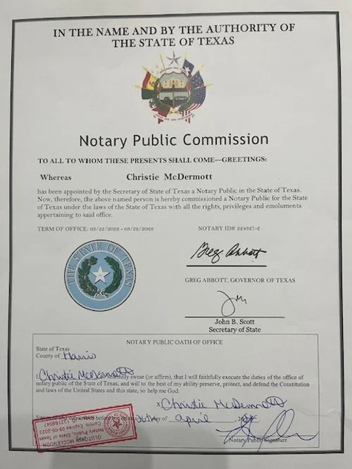 Hi there! I'm Christie McDermott, a mobile Notary Public commissioned by the State of Texas and an NNA Certified Signing Agent. With a colorful personality and a servant's heart, I bring integrity and reliability to every service I offer. Based in the Clear Lake, Texas area, I specialize in sellers' packages, purchase packages, refinances, and home equity line of credit loans. My goal is to make your purchasing or selling experience smooth and professional.